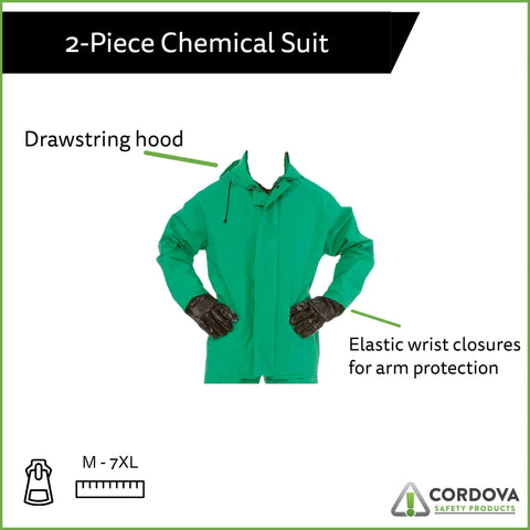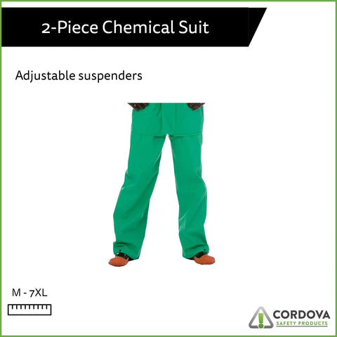 - 2-PIECE CHEMICAL SUIT: Protect yourself from chemicals and other hazards with this suit; Includes self-extinguishing jacket and bib pants with adjustable suspenders