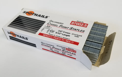 Spot Nails 87002.5 22GA 3/8-inch Crown Staples 5/32-inch Length 10,000 per Box. Spot Nails is along time leader in manufacturing collated nails, staples and tools for the pneumatic market specializing in making interchange products for all the leading brands.